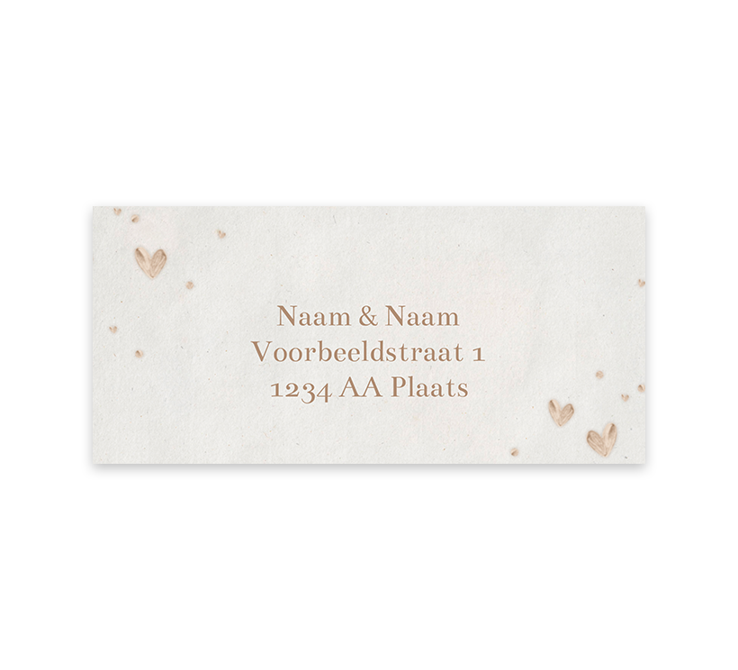 Adresstickers met zachte aardetinten. Elke sticker heeft schattige kleine hartjes. Toch liever een ander ontwerp? Ook dat kan in de editor aangepast worden. Ieder vel bevat twaalf adresstickers.