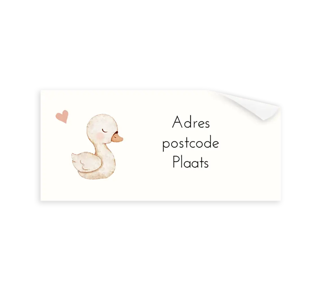Deze adresstickers heeft een illustratie van een baby eendje en hartje In onze online editor kan op iedere sticker een ander adres ingevuld worden. Liever een ander kleur hartje? Ook dat kan in de editor aangepast worden.