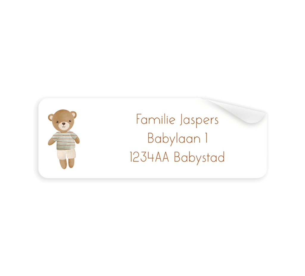 Een witte adressticker passend bij het geboortekaartje. De stickers hebben een illustratie van een knuffel beer. Pas het ontwerp naar wens zelf aan.