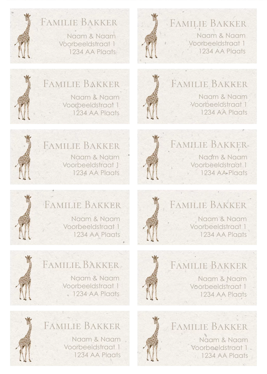 Een bijpassende adressticker bij jouw geboortekaartje. Deze sticker heeft een lieve giraffe met hartje. De adresstickers zijn geheel zelf te bewerken! In onze online editor kan op iedere sticker een ander adres ingevuld worden. Ieder vel bevat twaalf adresstickers.