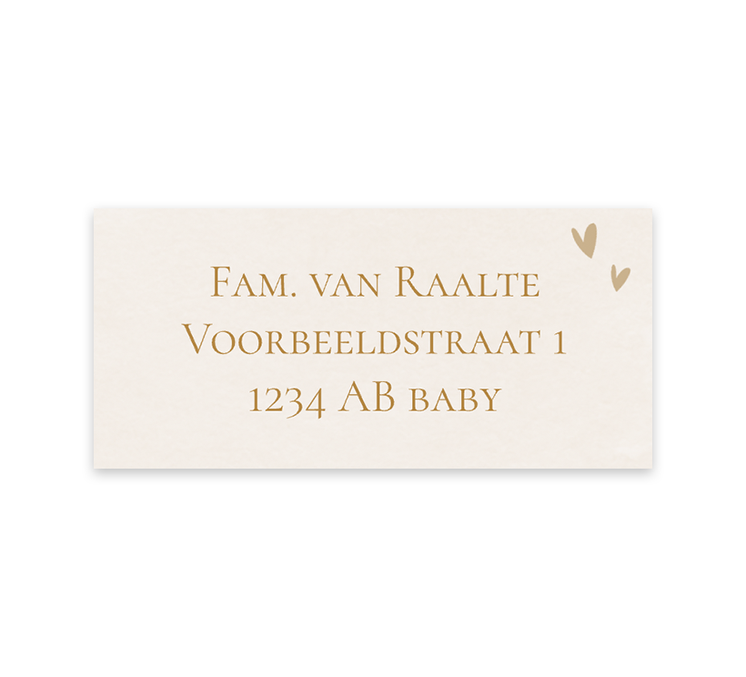 Deze adresstickers hebben een beige achtergrond met lieve hartjes. In onze online editor kan op iedere sticker een ander adres ingevuld worden. Toch liever een ander ontwerp? Ook dat kan in de editor aangepast worden. Ieder vel bevat twaalf adresstickers.