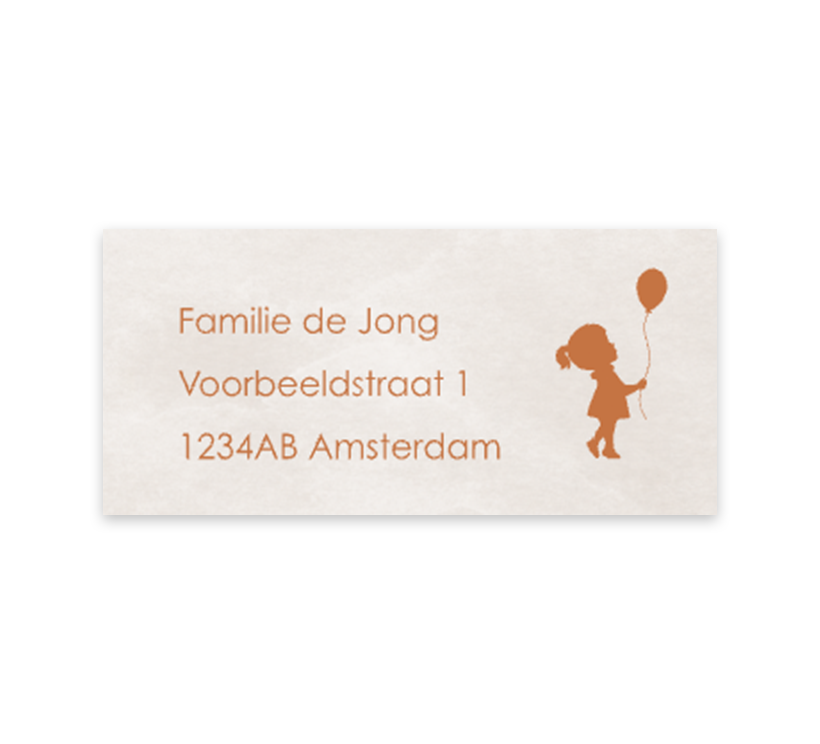 Een schattige adressticker passend bij het geboortekaartje van jouw meisje. De stickers hebben een beige achtergrond met watercolour. Daarop zie je een lief silhouetje van een meisje met een ballon. Op ieder vel zitten 12 adresstickers.