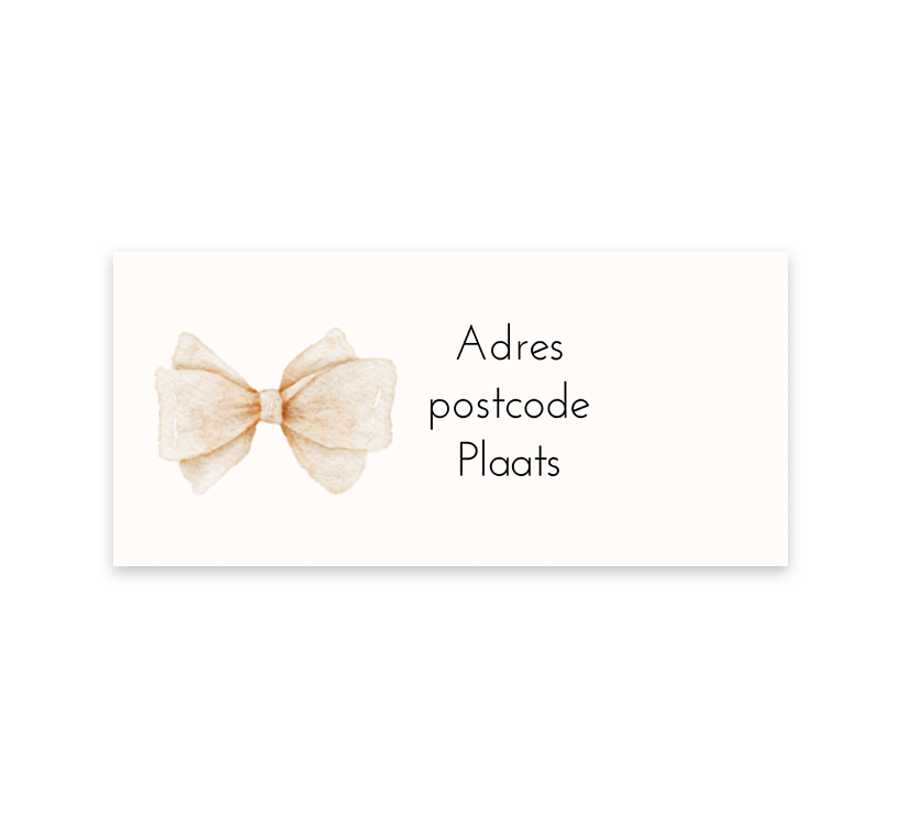 Een klassieke adressticker passend bij het geboortekaartje. Op de sticker zie je een prachtige illustratie van een beige strik. De sticker is naar wens aan te passen in onze online editor.
