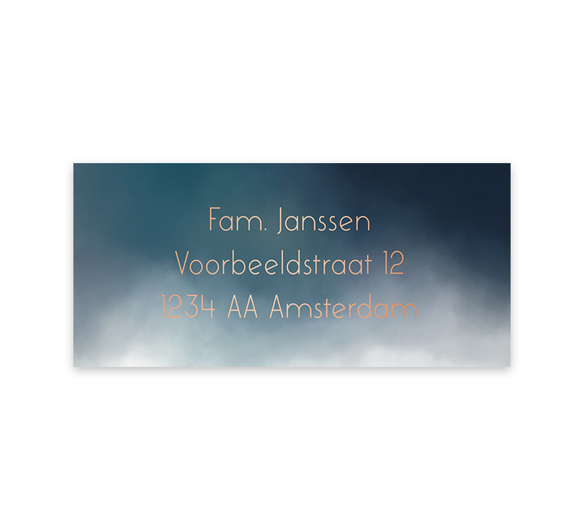 Een stijlvolle adressticker passend bij het geboortekaartje. Deze sticker heeft een donker blauwe watercolour met daarop hoogglans letters. Pas het ontwerp naar wens zelf aan.