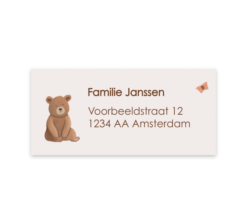 Een vrolijke en lieve adressticker passend bij het geboortekaartje. Op deze adressticker zie je een lief beertje en een vlindertje. De adressen pas je gemakkelijk aan in onze online editor.