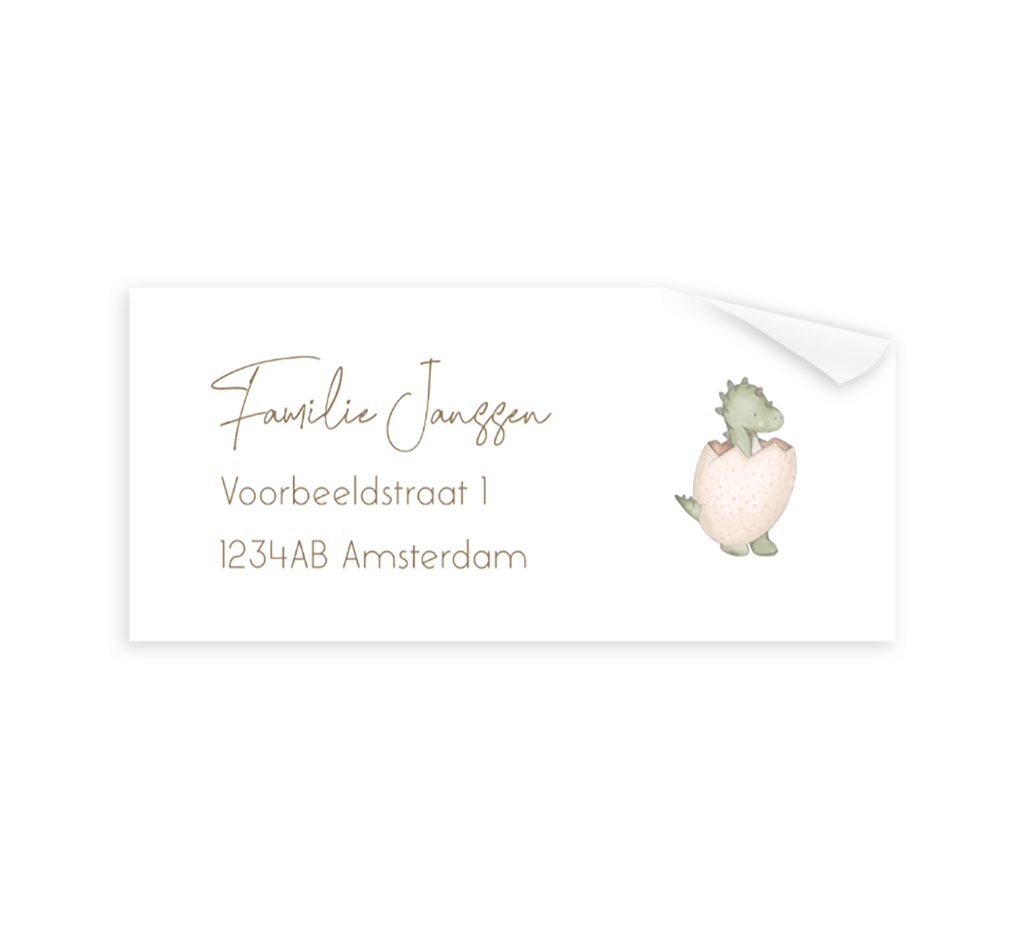 Deze adresstickers zijn geheel zelf te ontwerpen! Op deze sticker zie je een lieve dino. In onze online editor kan op iedere sticker een ander adres ingevuld worden. Toch liever een ander ontwerp? Ook dat kan in de editor aangepast worden.