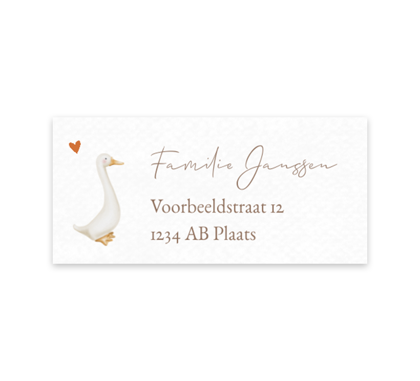 Verzend de geboortekaartjes in stijl met deze adresstickers! Op de adressticker staat de illustratie van een gans met klein hartje. De adresstickers zijn naar wens aan te passen in onze online editor.