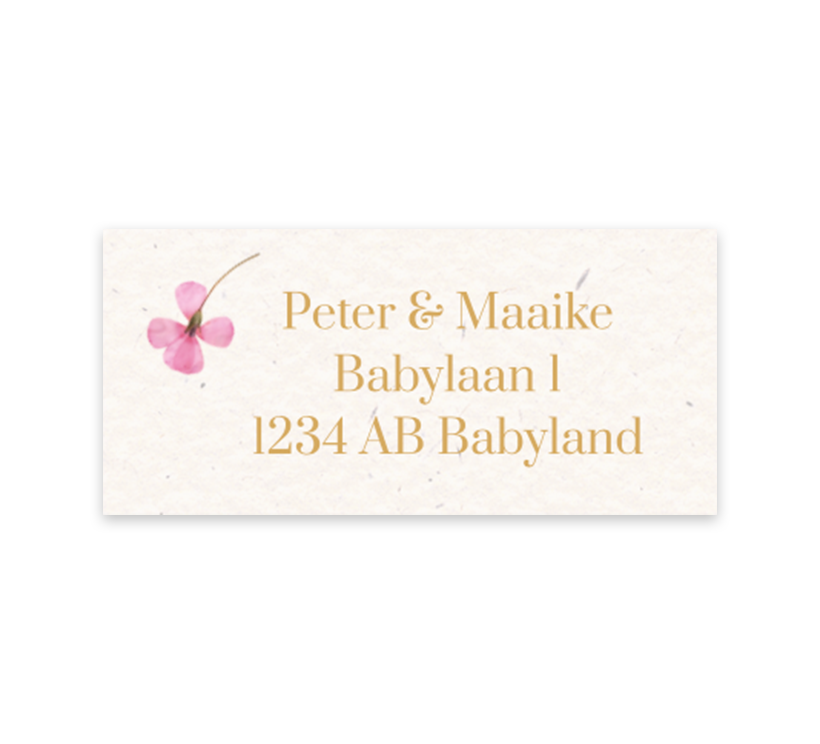 Een stijlvolle en lieve adressticker met beige achtergrond. Daarnaast zie je een lief roze droogbloem in de hoek van iedere sticker. Pas de stickers naar wens aan in de editor. Elk vel bestaat uit 12 adresstickers.