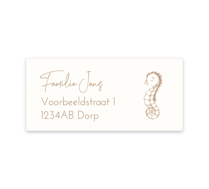 Verzend de geboortekaartjes in stijl met deze adresstickers. De stickers hebben een lichte achtergrond met een getekend zeepaardje. De adresstickers kunnen naar wens aangepast worden in onze online editor.