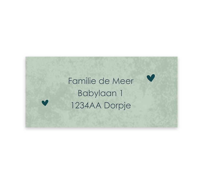 Adresstickers met zachte groene velvet-look. Elke sticker heeft schattige kleine hartjes. Toch liever een ander ontwerp? Ook dat kan in de editor aangepast worden. Ieder vel bevat twaalf adresstickers.