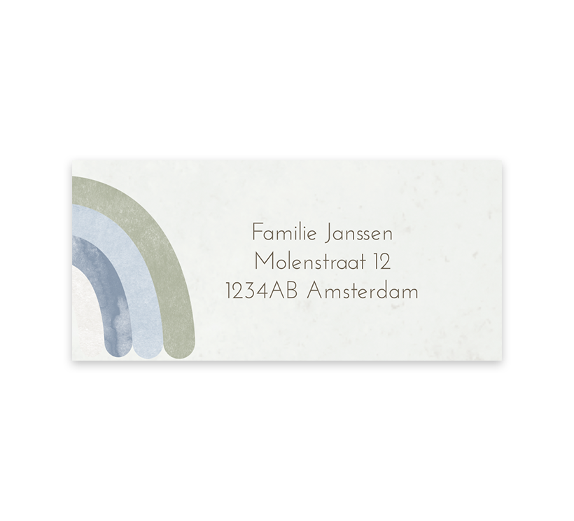 Deze adresstickers hebben een lichtgroene achtergrond met regenboog in blauw- en groentinten. In onze online editor kan op iedere sticker een ander adres ingevuld worden. Ook kan het design van de stickers helemaal aangepast worden naar eigen wens. Ieder vel bevat twaalf adresstickers.