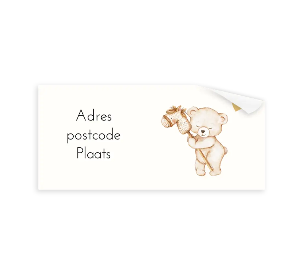 Deze adresstickers zijn geheel zelf te ontwerpen! In onze online editor kan op iedere sticker een ander adres ingevuld worden. Op de adressticker staat een illustratie van een beige teddybeertje met stokpaard.