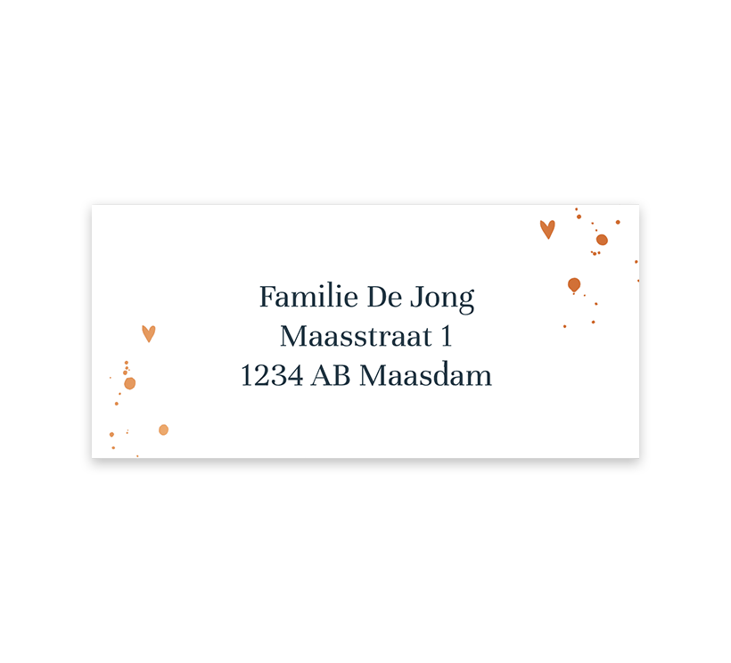 Bijpassende adresstickers bij het donkerblauwe velvet geboortekaartje. Op de witte achtergrond staan hartjes en spetters in hoogglans. De adressen pas je zelf eenvoudig aan in de online editor.