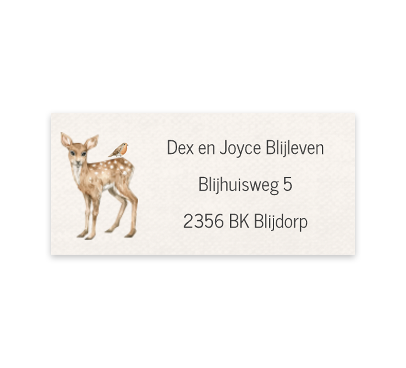 Het versturen van de geboortekaartjes wordt een feestje met deze adresstickers! Op de stickers lees je het adres en zie je een getekend hertje. De stickers kunnen naar wens aangepast worden in onze online editor.