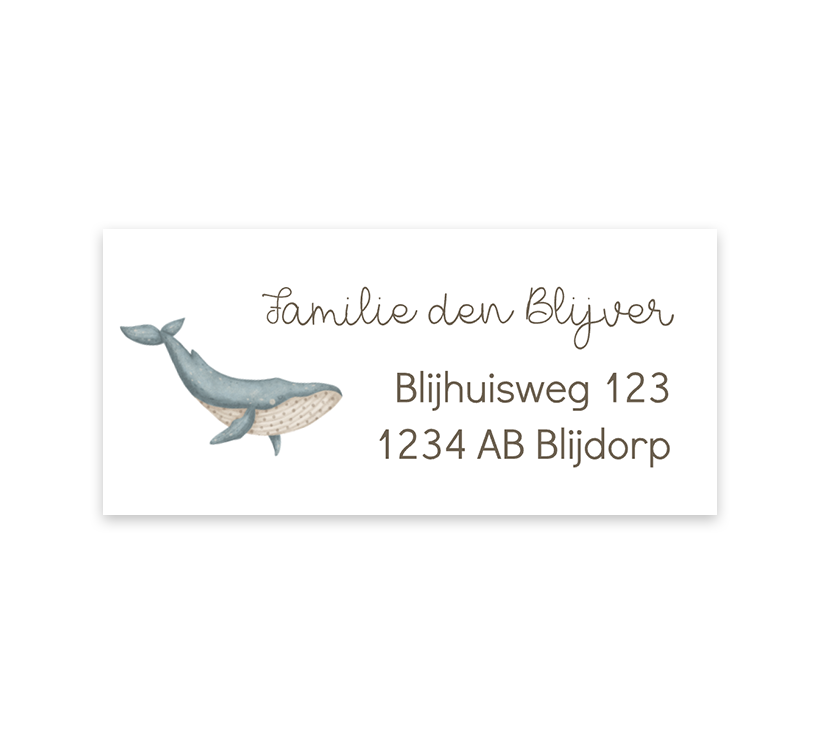 Het versturen van de geboortekaartjes wordt een feestje met deze adresstickers. Naast het adres staat de illustratie van een walvis. De stickers zijn helemaal naar wens aan te passen in onze online editor.