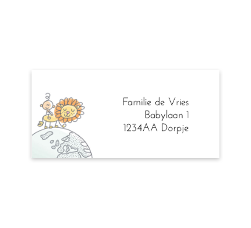 Deze adresstickers zijn geheel zelf te ontwerpen! Op de witte sticker zie je vrolijke illustraties van jungledieren op een wereldbol. In onze online editor kan op iedere sticker een ander adres ingevuld worden. Ieder vel bevat twaalf adresstickers.