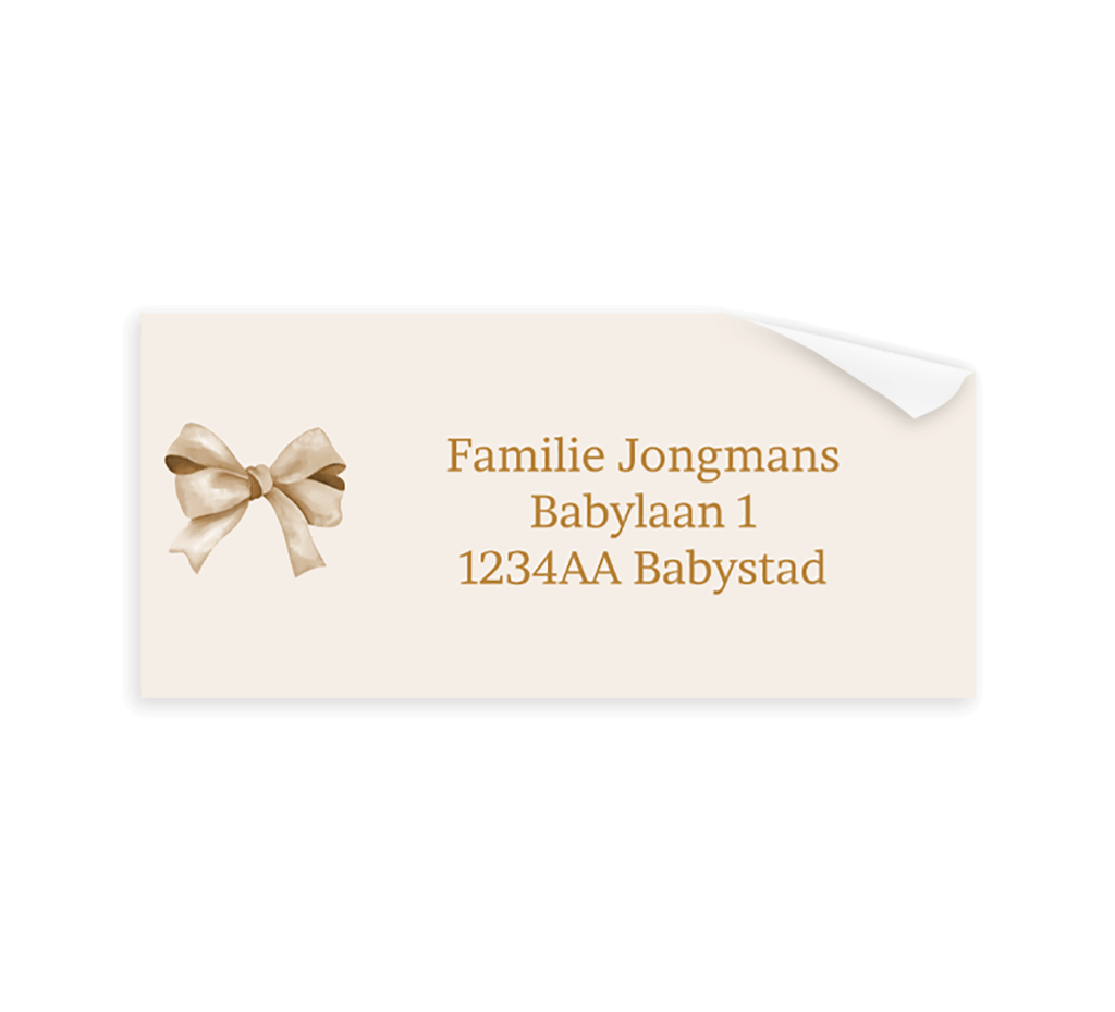 Toffe adresstickers passend bij het geboortekaartje van jouw kindje. De stickers hebben een illustratie van een beige strik. Pas het ontwerp naar wens aan in onze online editor.
