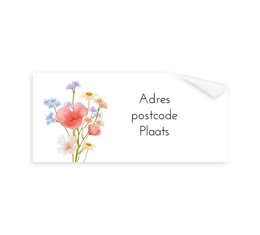 Een lieve adressticker passend bij het geboortekaartje. De sticker heeft een witte achtergrond met daarop veldbloemen. Pas het ontwerp naar wens aan in onze online editor.