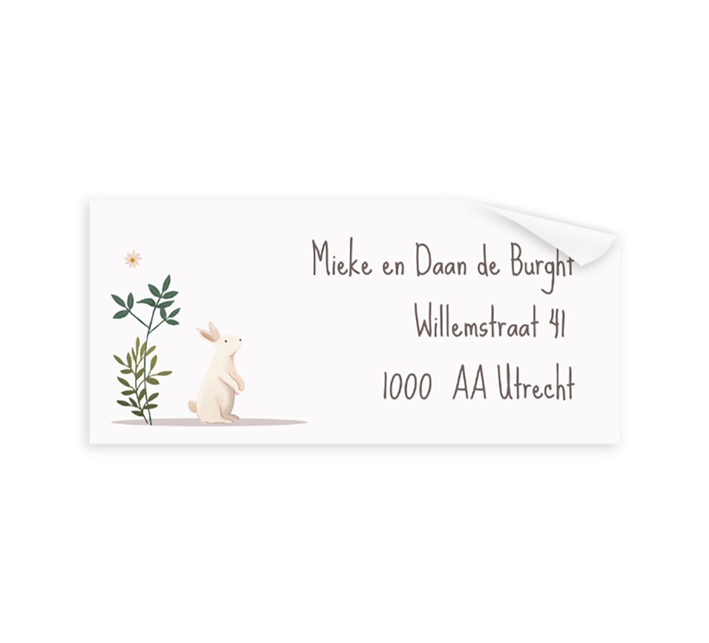 Maak het versturen van de kaartjes een feestje met deze adresstickers. Op de stickers lees je het adres en zie je de illustratie van een konijntje, takjes en vlinder. De stickers zijn naar wens te bewerken in onze online editor.