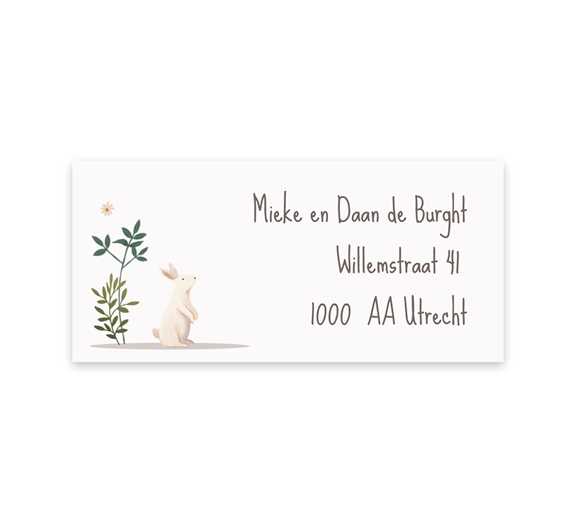 Maak het versturen van de kaartjes een feestje met deze adresstickers. Op de stickers lees je het adres en zie je de illustratie van een konijntje, takjes en vlinder. De stickers zijn naar wens te bewerken in onze online editor.