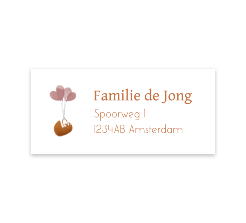 Een lieve adressticker met witte achtergrond en koperkleurige tekst. Aan de linkerkant zie je een lieve illustratie van een mandje aan ballonnetjes. Pas de adressen zelf aan en maak het verzenden nog makkelijker.