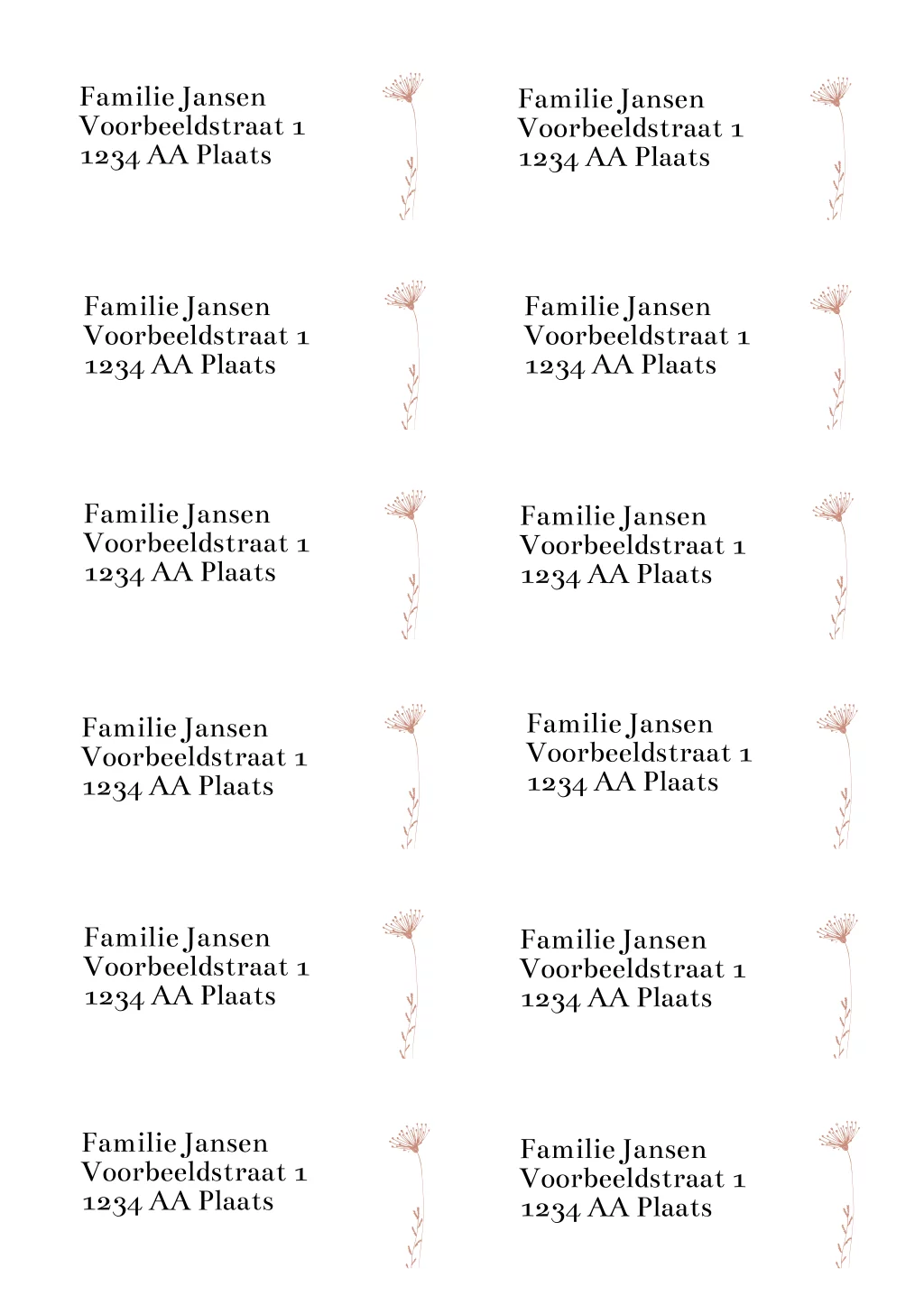 Een stijlvolle adressticker passend bij het geboortekaartje. De sticker heeft een witte basis met een lijntekening van een bloem. Ieder vel bevat 12 adresstickers. Pas het ontwerp naar wens zelf aan.