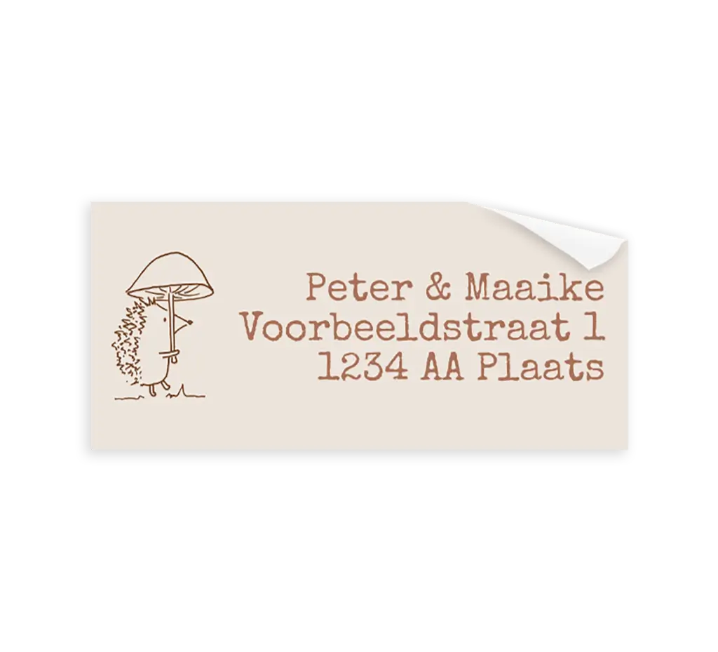 Deze adresstickers hebben een bruine achtergrond met de lijntekening van een klein egeltje. Het ontwerp van de stickers kan helemaal naar wens aangepast worden in onze online editor. Ook kunnen daar de juiste adressen ingevuld worden.