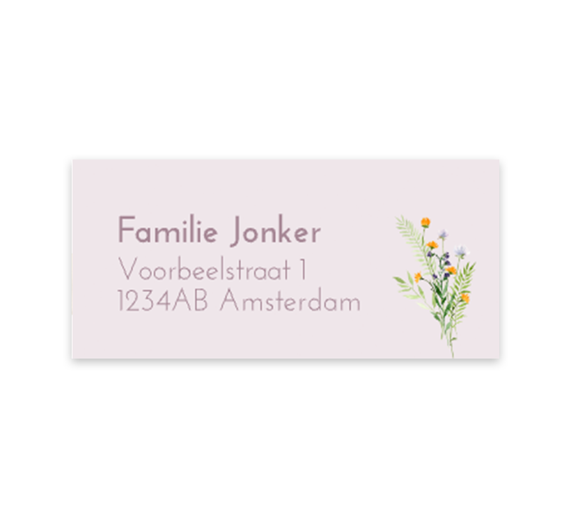 Een schattige bijpassende adressticker bij het geboortekaartje van jouw kindje. Deze sticker heeft een lila achtergrond met daarop een illustratie van verschillende veldbloemen. Pas de adressen zelf gemakkelijk aan. Elk vel heeft 12 adresstickers.
