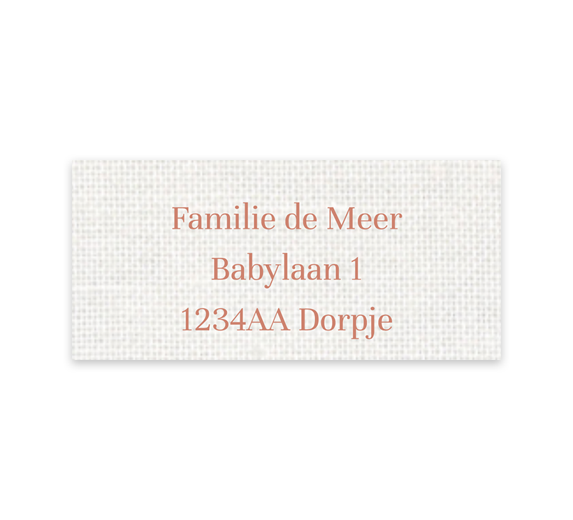 Bijpassende adressticker bij het linnen-look geboortekaartje. De tekst is in mooie koperkleur. In de online editor voer je eigen adressen in, er kunnen 12 adressen per stickervel worden ingevoerd.