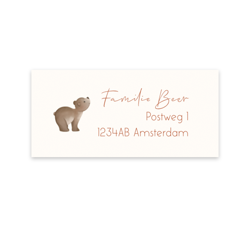 Een lieve adressticker met schattig beertje. Naast het beertje is er ruimte voor de adressen. Pas deze zelf gemakkelijk aan in onze online editor.
