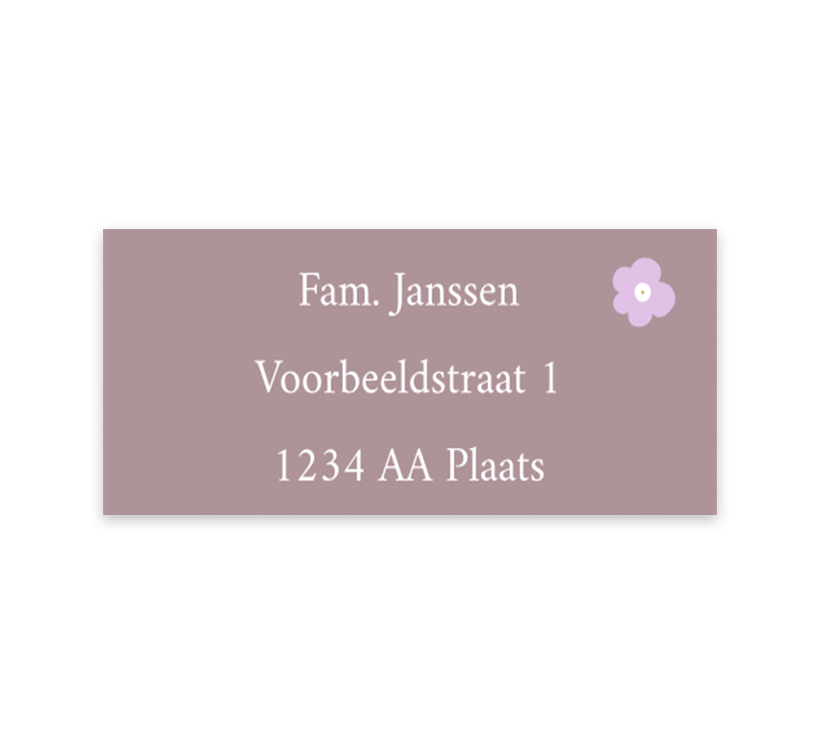 Deze adresstickers hebben een paarse achtergrond met lila bloemetjes en passen perfect bij het geboortekaartje. In onze online editor kan op iedere sticker een ander adres ingevuld worden. Ook kan het design van de stickers helemaal aangepast worden naar eigen wens. Ieder vel bevat twaalf adresstickers.