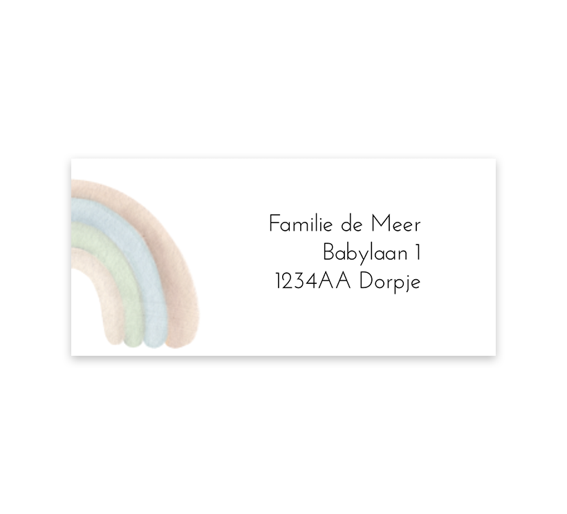 Een lieve adressticker passend bij jouw geboortekaartje. De stickers hebben een witte achtergrond met daarop een pastelkleurige regenboog. Pas de adressen op de sticker aan via onze online editor. Op ieder vel zitten 12 adresstickers.