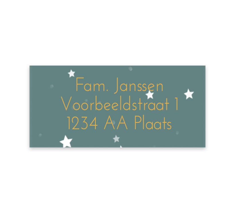 Deze adresstickers hebben een blauwgroene achtergrond met gouden opdruk en witte sterretjes. In onze online editor kan op iedere sticker een ander adres ingevuld worden. Ook kan het design van de stickers helemaal aangepast worden naar eigen wens. Ieder vel bevat twaalf adresstickers.