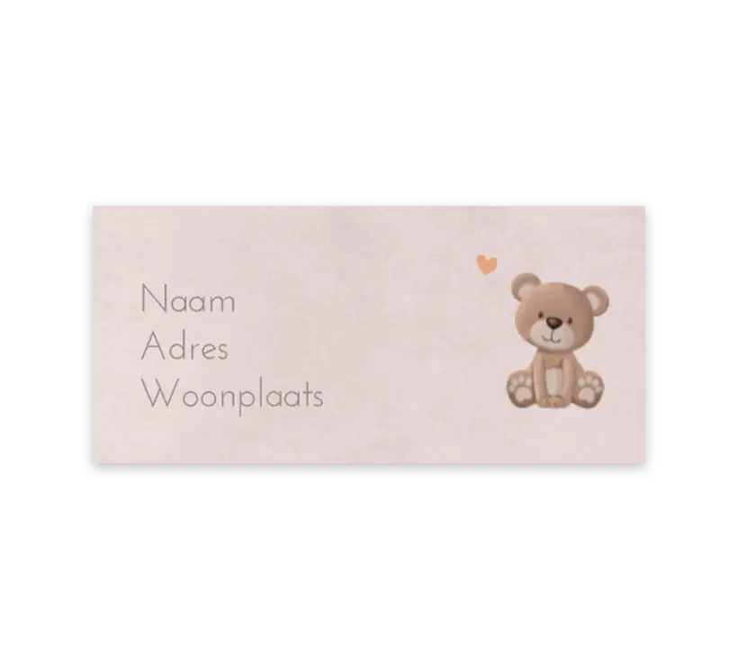 Een lieve roze adressticker voor op de envelop. De sticker heeft een roze achtergrond met daarop een lief teddybeertje. Deze adresstickers zijn geheel zelf te ontwerpen! In onze online editor kan op iedere sticker een ander adres ingevuld worden. Toch liever een ander ontwerp? Ook dat kan in de editor aangepast worden. Ieder vel bevat twaalf adresstickers.