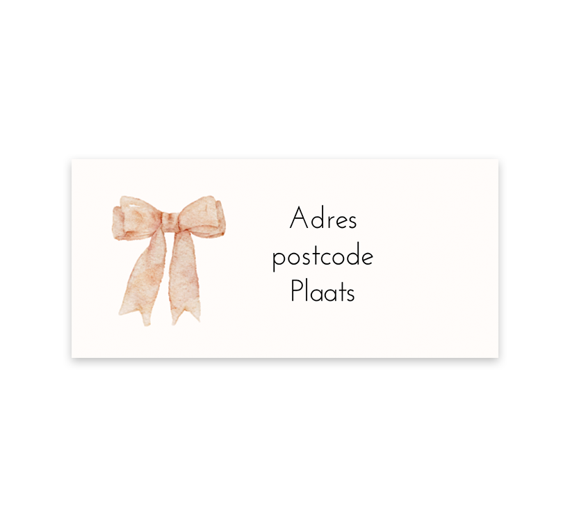 Een klassieke adressticker passend bij het geboortekaartje. Op de sticker zie je een prachtige illustratie van een roze strik. De sticker is naar wens aan te passen in onze online editor.