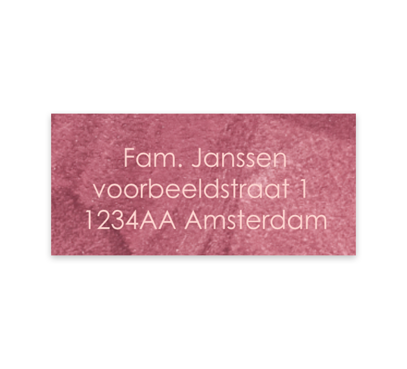 Deze adresstickers hebben een roze velvet-look achtergrond. Het ontwerp van de stickers kan helemaal naar wens aangepast worden in onze online editor. Ook kunnen daar de juiste adressen ingevuld worden. Ieder vel bevat twaalf adresstickers.