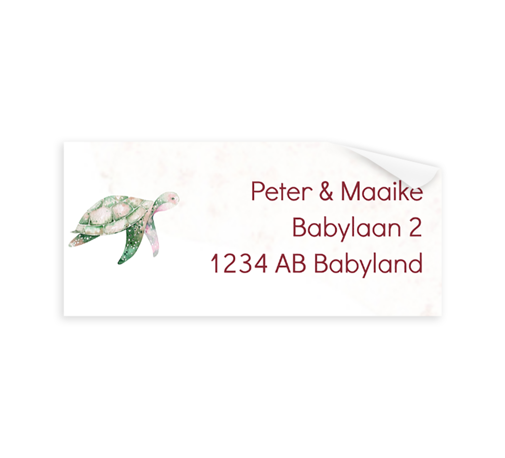 Verzend de geboortekaartjes in stijl met deze adresstickers. De stickers hebben een watercolour achtergrond met de illustratie van een schildpad. De adresstickers zijn naar wens aan te passen in onze online editor.