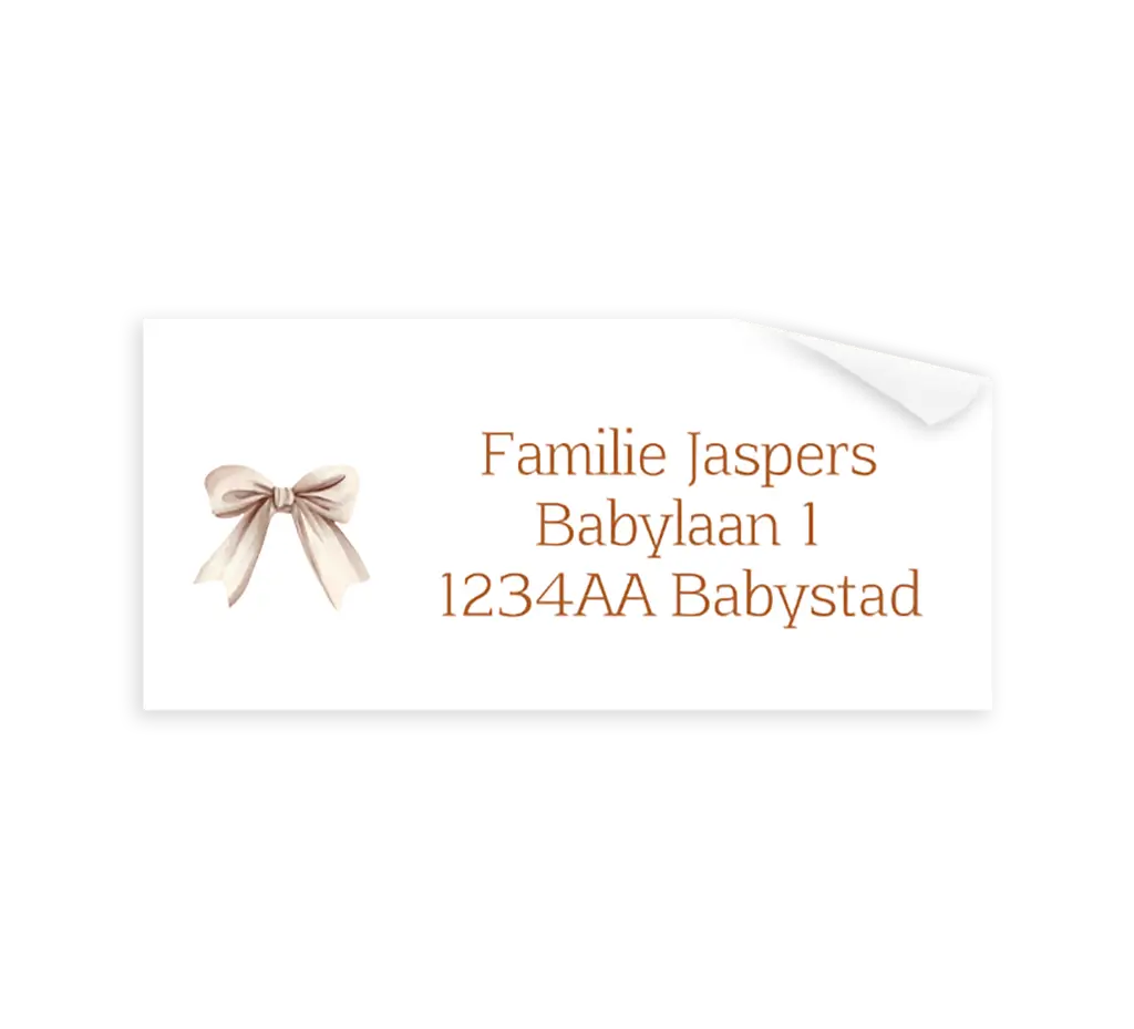 Maak de aankondiging van de geboorte van jullie kleintje nog persoonlijker door deze adresstickers, passend bij het design van het geboortekaartje. De stickers hebben roodbruine belettering met een schattig, beige strikje. Pas elk adres individueel aan in de online editor.
