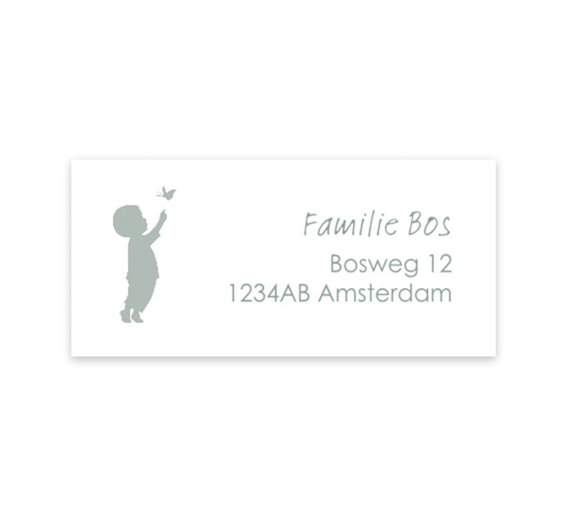 Bijpassende sluitstickers voor bij het geboortekaartje. De stickers hebben een lief groen silhouetje van een jongetje. Pas de adressen gemakkelijk zelf aan in onze online editor. Ieder vel bevat twaalf adresstickers.