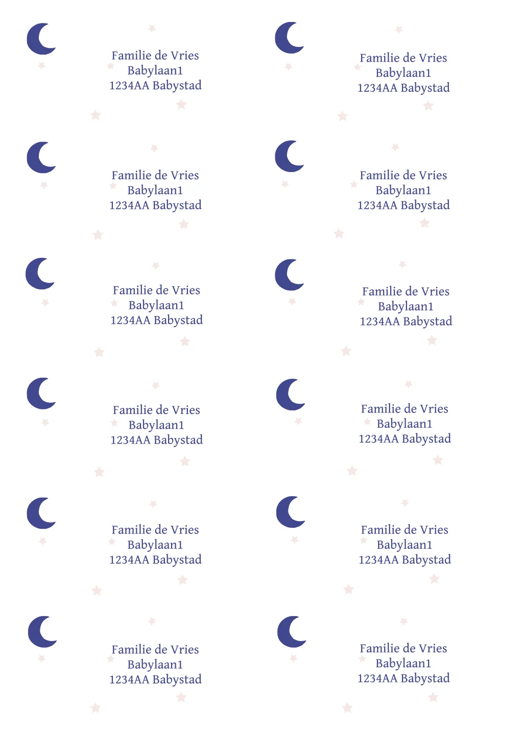 Een bijpassende adressticker voor op de envelop. De witte sticker heeft een blauw maantje en kleine sterretjes. Ieder vel bevat 12 stickers.