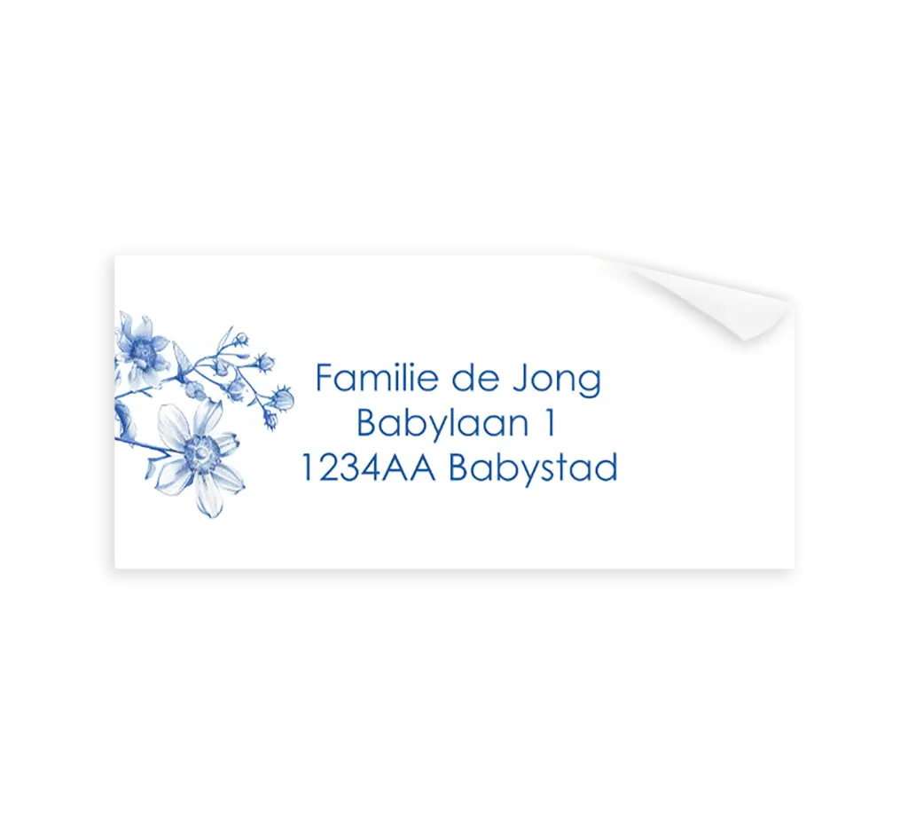 Verzend de geboortekaartjes in stijl met deze adresstickers. De stickers hebben een witte achtergrond met de illustraties van Delfts blauwe bloemen. De stickers kunnen naar wens aangepast worden in onze online editor.