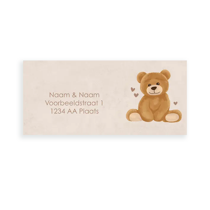 Stijvolle en lieve adresstickers met bruine velvet-look achtergrond. In de hoek van de adressticker staat een lieve teddybeer. Pas de adressen aan in onze online editor en bestel de adresstickers voor jouw geboorteaankondiging.