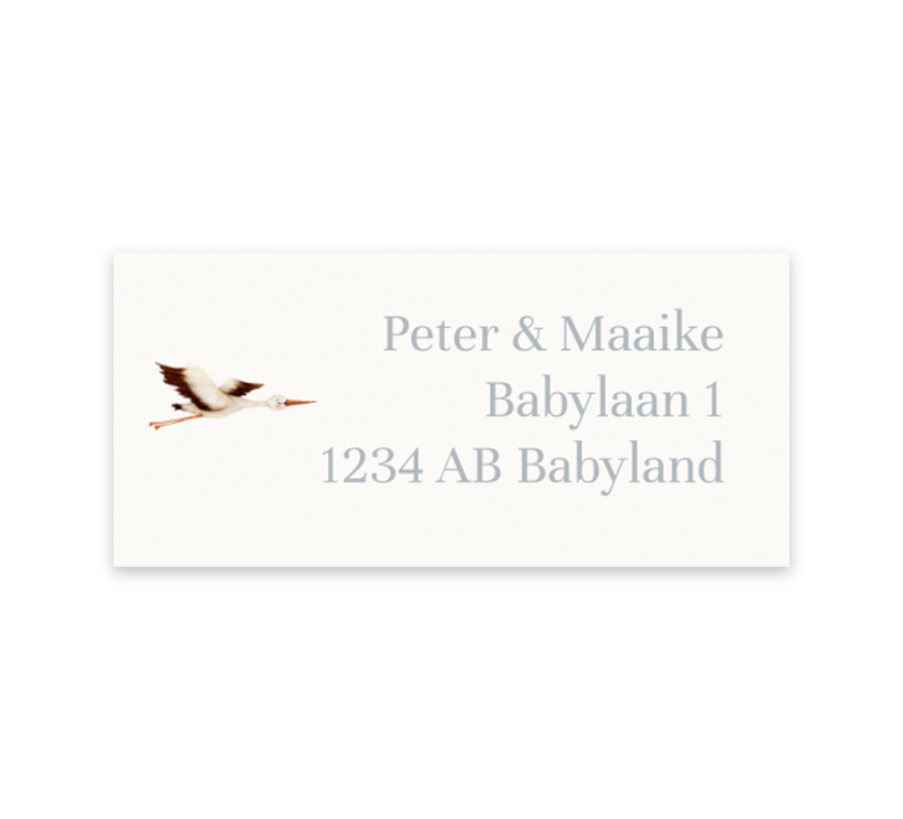 Een stijlvolle adressticker voor bij het geboortekaartje van jouw kindje. De stickers hebben een crème achtergrond met een vliegende ooievaar erop. Pas het ontwerp naar wens aan in onze online editor.