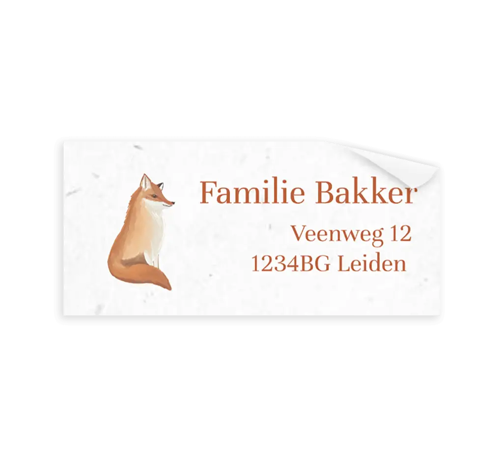 Een adressticker passend bij het geboortekaartje. Op de sticker staat het adres en een illustratie van een vos. Pas de sticker naar wens aan in onze online editor.