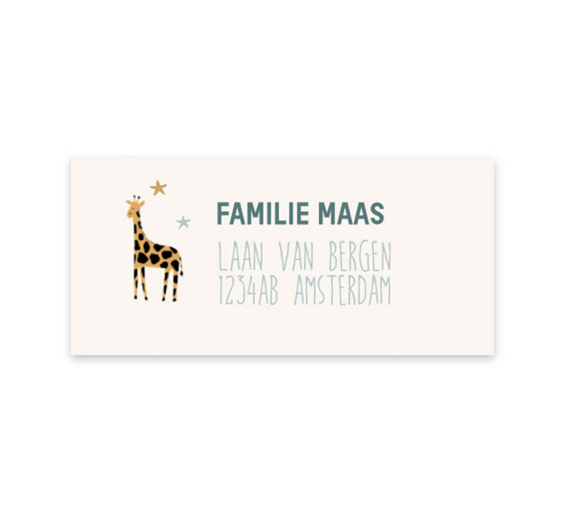 Een vrolijke adressticker voor jouw geboortekaartje. De sticker heeft een lieve illustratie van een giraffe omringd door sterretjes. Vul zelf de adressen in en maak het verzenden nog makkelijker.