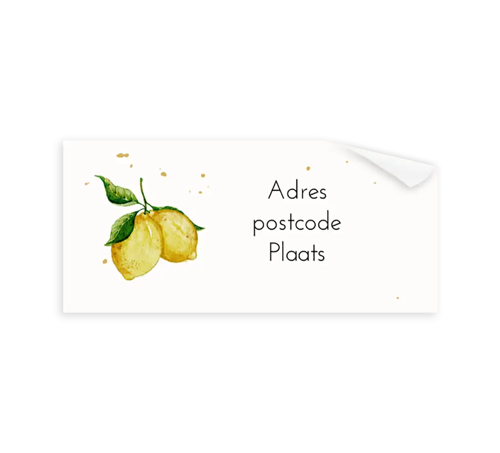 Een vrolijke en frisse adresstickers voor op de envelop. De sticker heeft een gespikkelde achtergrond met daarop illustraties van citroenen. Pas het ontwerp naar wens aan in onze online editor.
