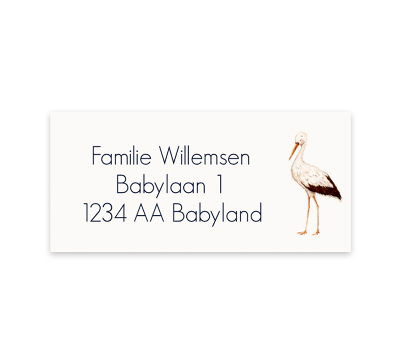 Verstuur jullie geboortekaartjes met deze bijpassende adreslabels, zo heb je een mooi geheel! Naast de tekst staat een prachtige illustratie van een watercolour ooievaar. Pas de adressen aan in de online editor en bestel.