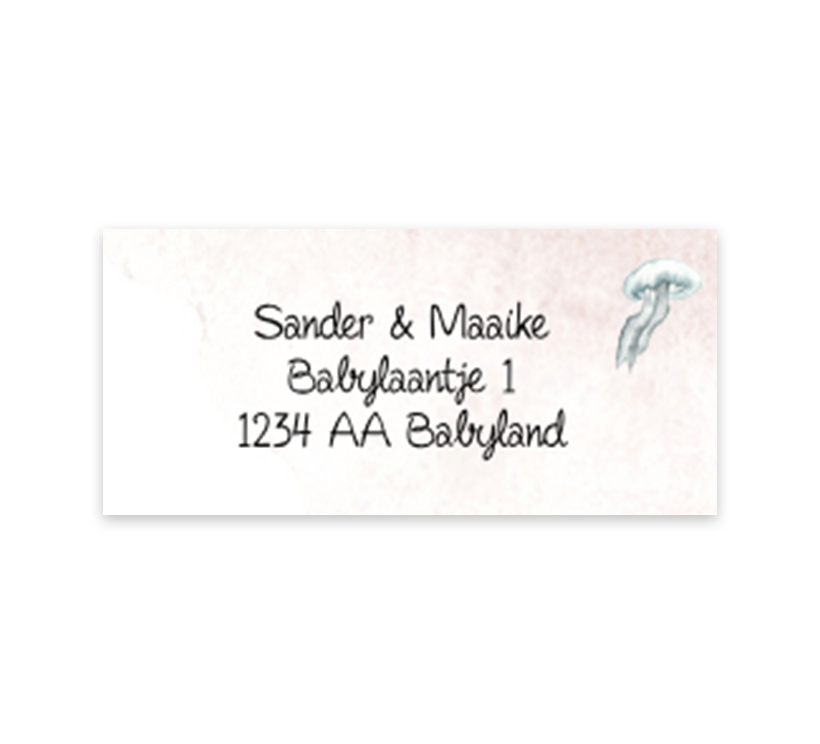 Verzend de geboortekaartjes in stijl met deze adresstickers. De stickers hebben een watercolour achtergrond met de illustraties van kwallen en zeesterren. De adresstickers zijn naar wens aan te passen in onze online editor.