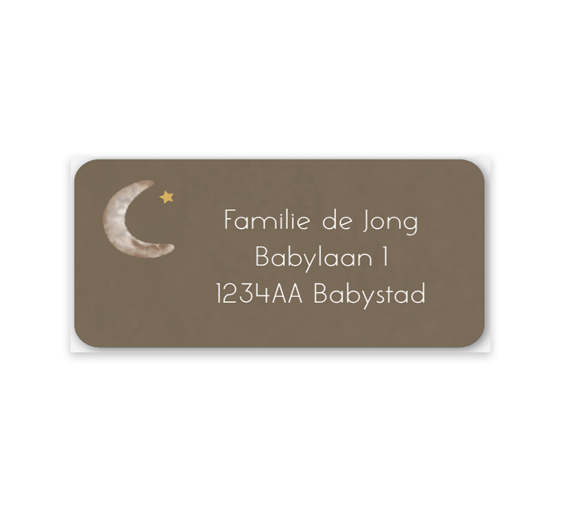 Verzend de geboortekaartjes in stijl met deze adresstickers. De stickers hebben een donkere achtergrond met watercolour maan en sterren. De stickers zijn naar wens te bewerken in onze online editor.