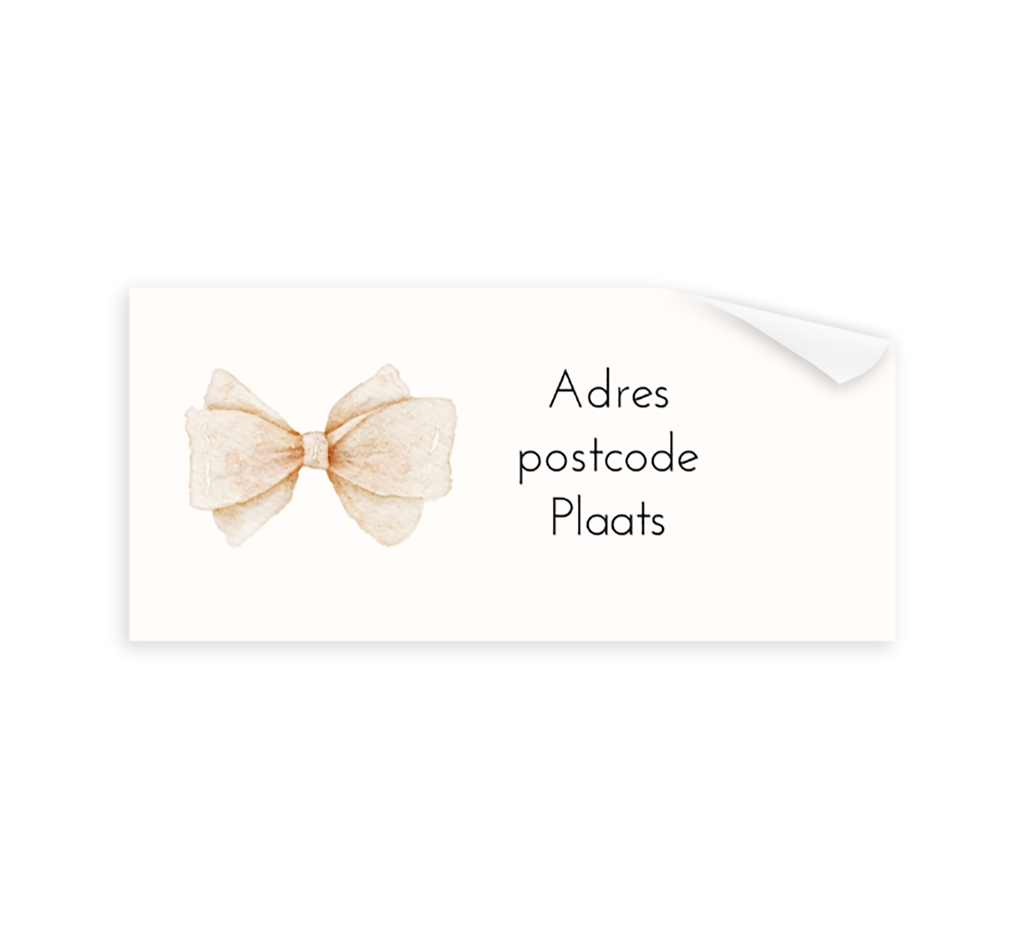 Een klassieke adressticker passend bij het geboortekaartje. Op de sticker zie je een prachtige illustratie van een beige strik. De sticker is naar wens aan te passen in onze online editor.
